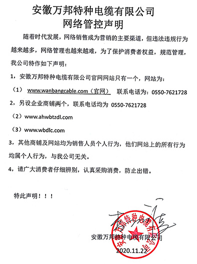 鄭重聲明:安徽萬邦特種電纜有限公司官方網站為:www_wanbangcable_com.bjans.com,除此之外無任何子網站或合作網站,其余均為假冒偽劣。電話:0550-7621728 13485756353 地 址:安徽省天長市滁州高新技術產業開發區經四路29號
